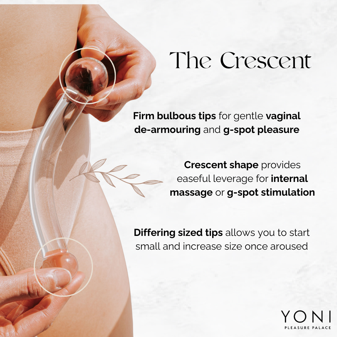 The Crescent is the perfect tool for gentle vaginal de-armouring, releasing pelvic tension and also G-spot pleasure! It has one larger end and one smaller end, meaning you can choose which size you wish to massage internally. We recommend starting with the smaller bulbous tip and working your way up to the larger end when you feel more aroused and open.