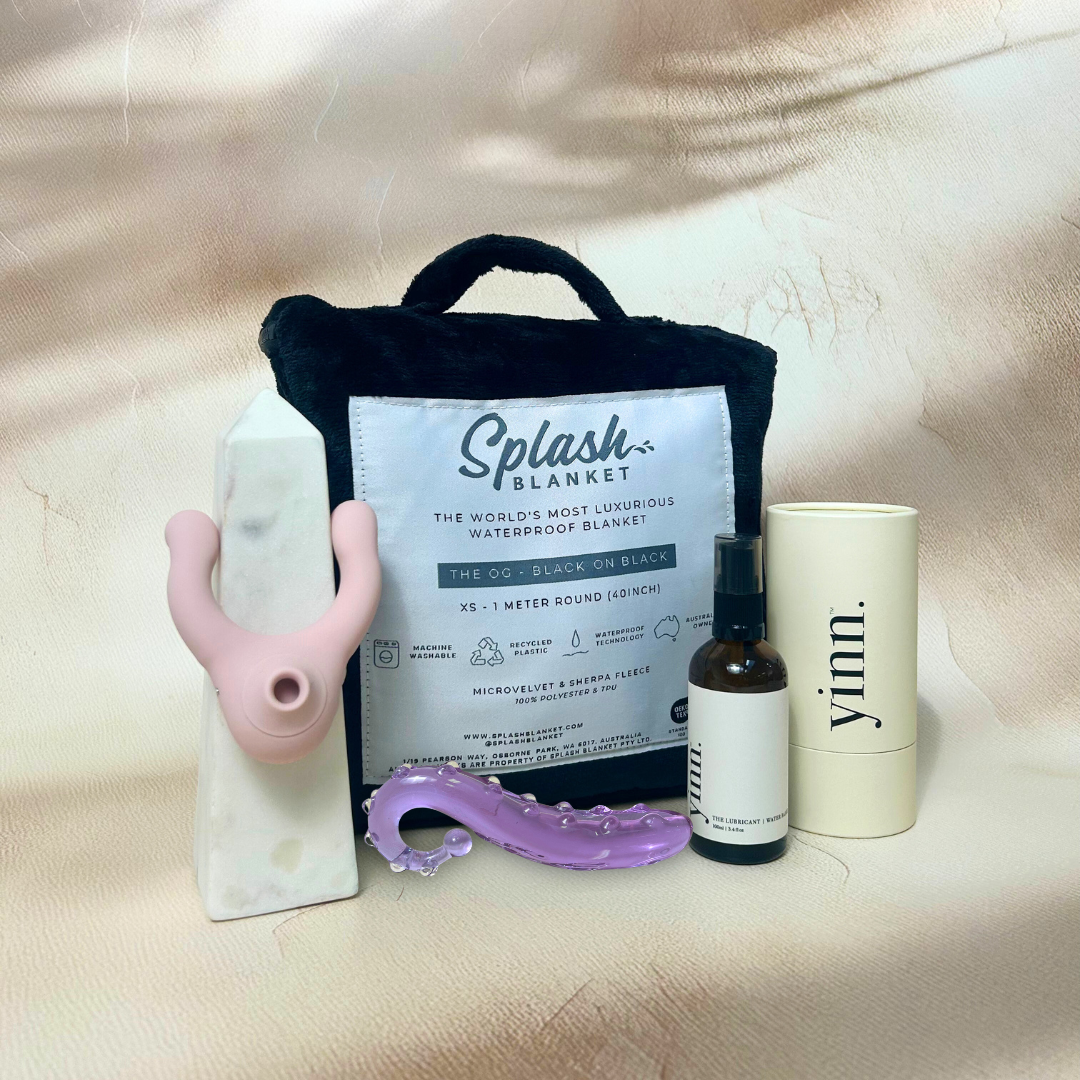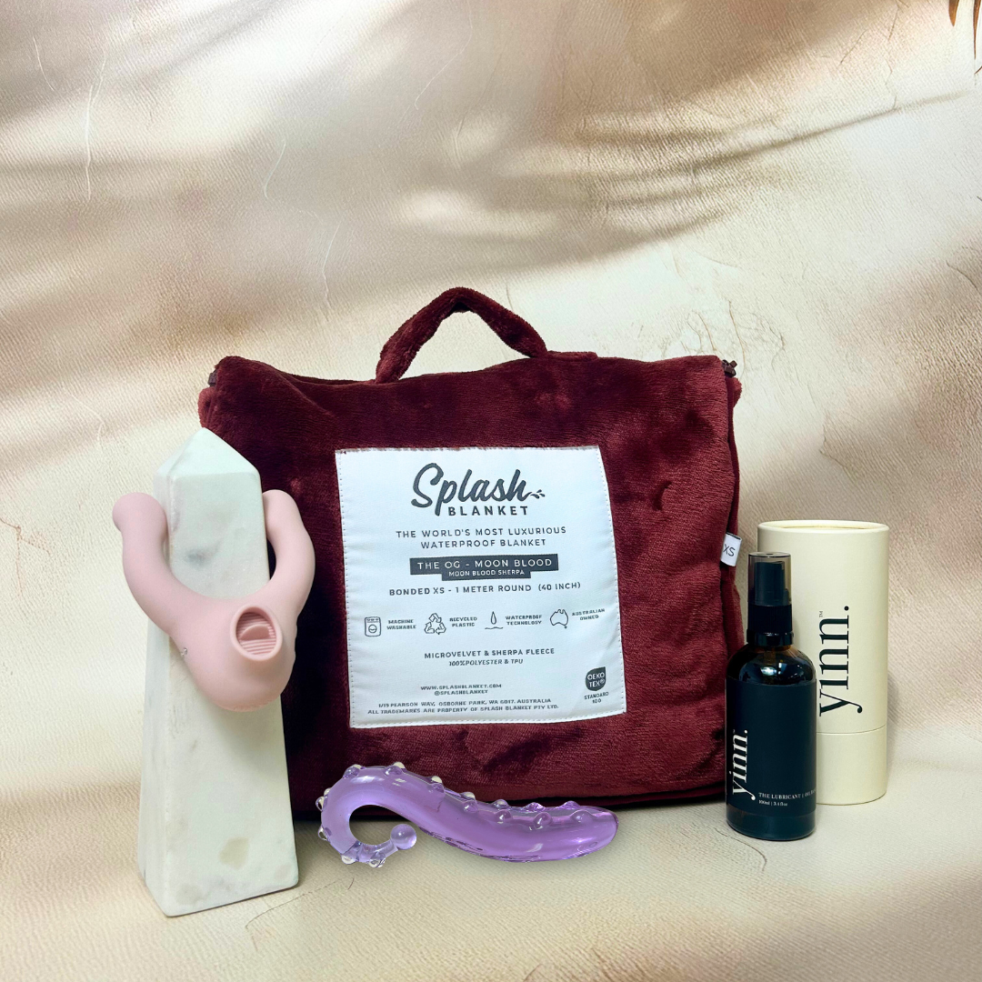 Including a Waterproof Squirt Blanket™, our ICONIC Sacred Squirter, one of our Pleasure Wand Vibrators,  and your option to add on a natural & organic Yinn Lubricant  .