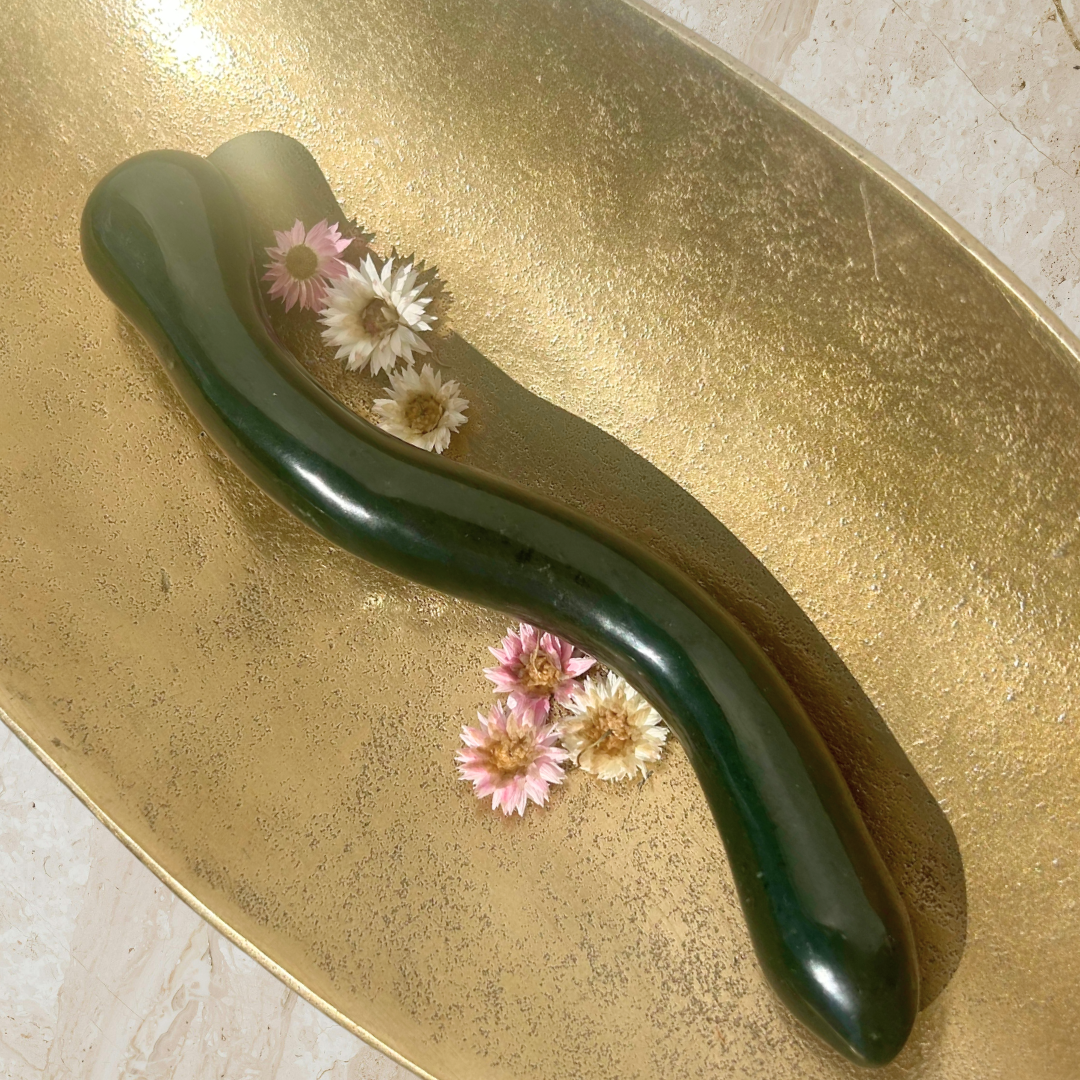 The Crystal Serpent in Nephrite Jade is a deeply grounding, beautifully weighted internal massager designed for those who crave depth, intention and powerful internal connection. Its weight does much of the work for you, encouraging slow, steady pressure.